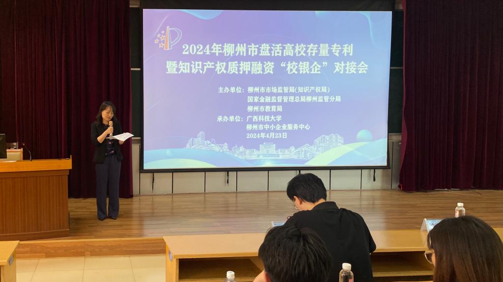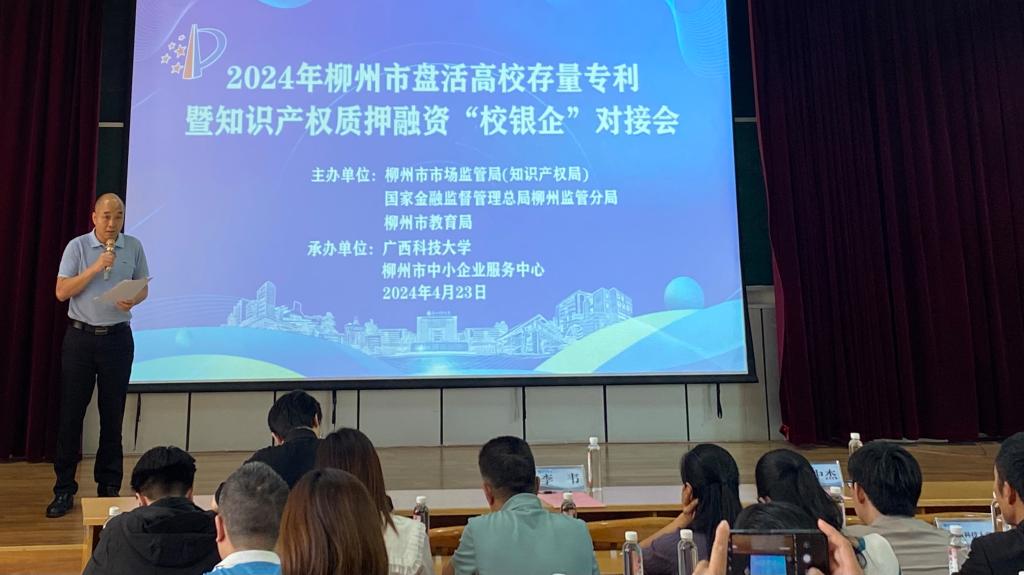 4月23日,柳州市市场监管局(知识产权局)、国家金融监督管理总局柳州监管分局、柳州市教育局联合主办,我校与柳州市中小企业服务中心联合承办的2024年全国知识产权宣传周柳州市盘活高校存量专利暨知识产权质押融资“校银企”对接会,在文昌校区四阶四培训教室召开。柳州市市市场监管局(知识产权局)副局长吕中杰等单位领导,广西科技大学、柳州工学院、柳州职业技术学院、柳州铁道职业技术学院本地4所高校科研教师代表,中国银行、农业银行、交通银行、建设银行、北部湾银行等5家金融机构职业经理以及20多家企业代表参加了现场活动。