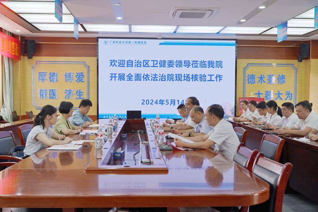 5月14日上午,自治区卫生健康委法规处(审批办)处长(主任)闫文带队到学校第一附属医院(第一临床医学院)开展2022-2023年度全面依法治院工作现场核验工作。医院党委书记庞晓红、党委副书记、院长覃天等院领导参加迎检。