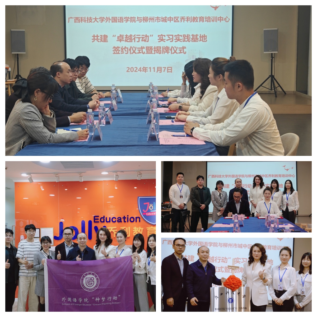 11月8日,外国语学院与乔利教育共建“卓越行动”实习实践基地签约授牌仪式在乔利教育会议室举行。学院党委书记李辉、党委副书记黄大志、研究生辅导员张林微、学生代表,以及乔利教育培训中心校长陆鹃、副校长韦忱忱等人参加活动。双方就学生实习、就业、校企合作进行了深入交流,共同签署了“卓越行动”实习实践基地共建协议。