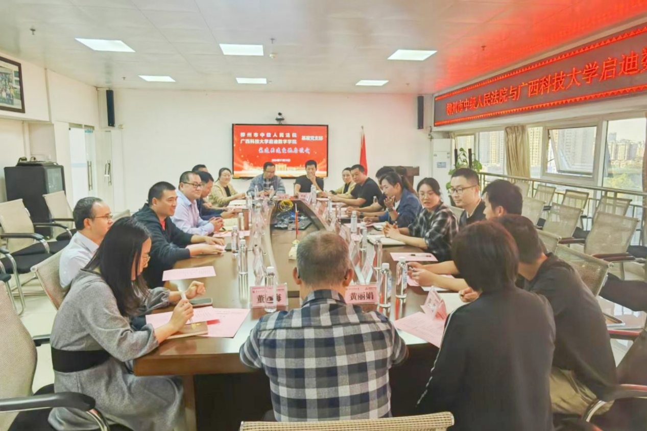 11月19日下午,应启迪数字学院教工党支部的邀请,柳州市中级人民法院办公室党支部、法警支队党支部、司法技术管理科党支部一行12人来校开展基层党支部共建交流活动。