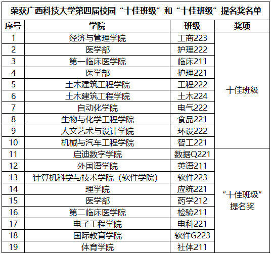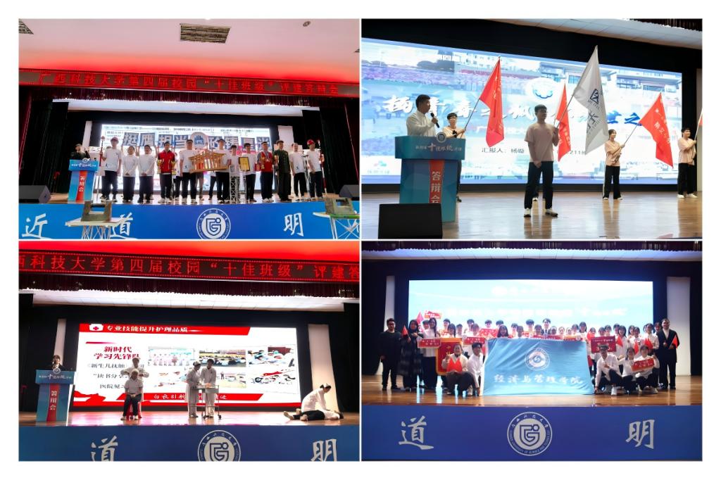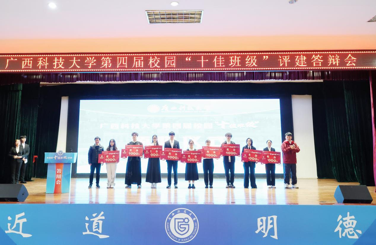 本次“十佳班级”评建活动自2024年3月起历时近10个月,经班级申报、学院推荐、材料审阅、网络投票,共有19个班级入围答辩环节。答辩会上,各班级重点围绕思想引领、学风建设、创新创业、素质发展和班级特色等方面展示班集体建设成果。经过激烈角逐,经济与管理学院工商223等10个班级脱颖而出,获评广西科技大学第四届校园“十佳班级”,启迪数字学院数据Q221班等9个班级荣获“十佳班级”提名奖。