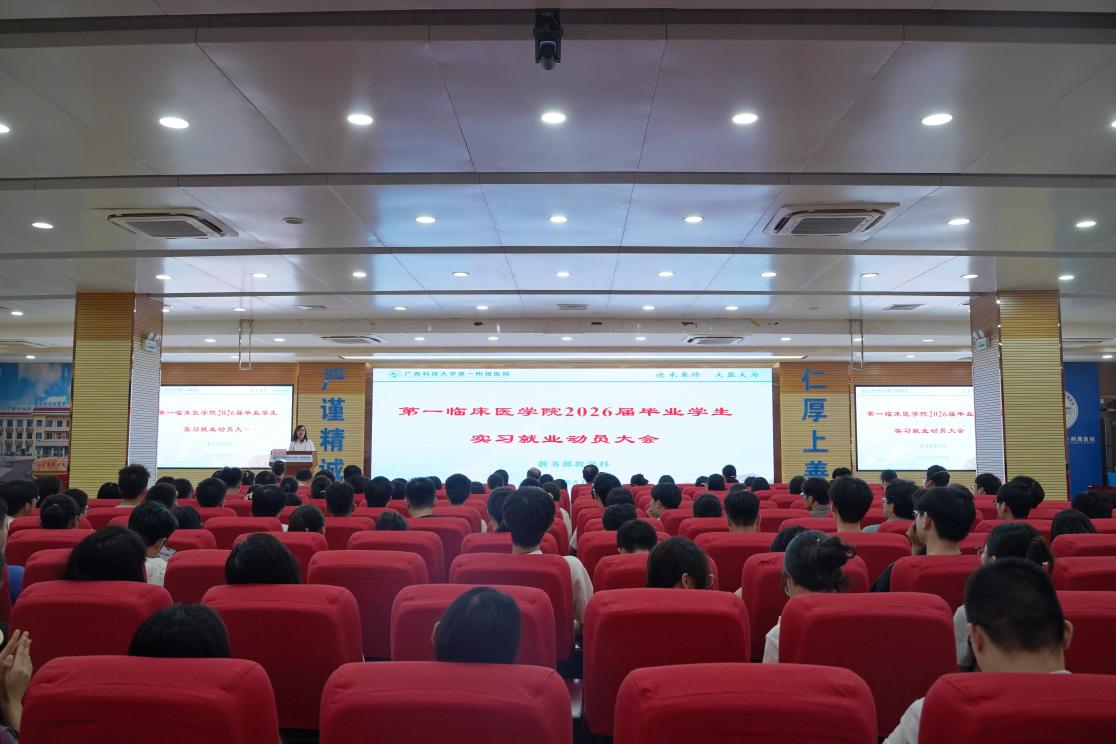 5月28日下午,第一临床医学院2026届毕业生实习就业动员会在第一附属医院学术报告厅举行。学院领导,学工办、教学科全体人员以及临床211-214班、康复21班全体学生参加会议,会上就实习期间的日常行为规范和安全纪律做了要求,学院领导勉励同学们要珍惜实践机会,锤炼专业技能,勇于拼搏进取,积极就业,奉献社会,为守护人民健康贡献青春力量。现场进行了集体宣誓。