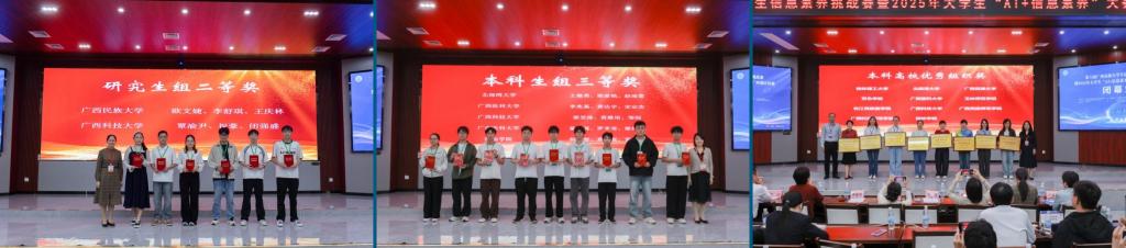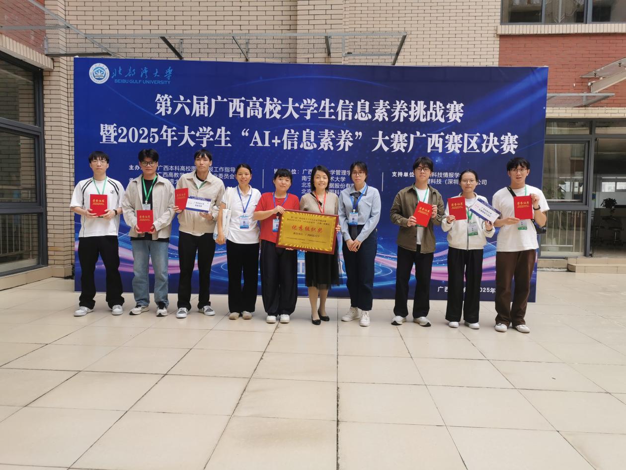 11月9日,第六届广西高校大学生信息素养挑战赛暨2025年大学生“AI+信息素养”大赛广西赛区比赛在北部湾大学圆满落幕。大赛是自治区教育厅认定的B类大学生学科专业竞赛项目,由广西高校图工委与广西高教图专委联合主办。我校图书馆馆长薛宏珍应邀担任大赛评委,并带队参加现场决赛。经过激烈角逐,我校参赛队伍在本科组团队赛中荣获广西赛区三等奖1项,研究生组比赛中荣获广西赛区二等奖1项;学校图书馆获评“优秀组织奖”,3位馆员获“优秀指导老师”称号。