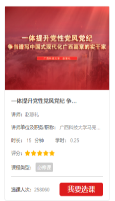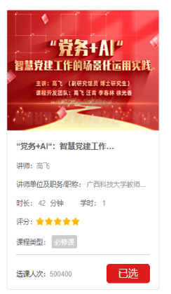近日,我校2025年申报的广西干部网络学院课程——马克思主义学院赵慧礼老师的《一体提升党性党风党纪 争当谱写中国式现代化广西篇章的实干家》、继教学院(教培中心)高飞老师的《“党务+ AI”:智慧党建工作的场景化运用实践》、外语学院金钱伟老师的《习近平文化思想引领下的民族地区中华民族共同体意识培育与实践路径》3门课程,在全区评选中全部入选课程库。其中,赵慧礼、高飞两位老师的课程,经自治区党委组织部评审,获评2025年全区干部网络培训必修课——这是我校干部培训课程首次获此荣誉,实现从“选修课”到“必修课”的跨越,标志着学校在服务地方干部教育、推动党建创新领域取得重要进展。同时,高飞老师的“党务+AI”课程,因紧扣人工智能趋势、探索智慧党建新路径,兼具时代性与可操作性,上线仅3个月选修人数突破50万人次,创学校近年同类课程纪录,当前在全区“AI”主题干部网络课程中热度排名第一。