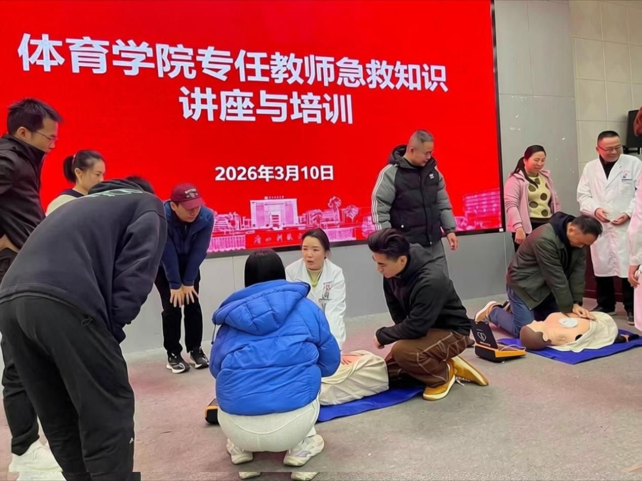 3月10日上午,体育学院在图书馆报告厅举办专任教师急救知识专题讲座与技能培训。校卫生所董丹苗、余坚勇、韦玮三位医护人员担任主讲及培训导师,体育学院全体专任教师参加培训。培训中,余坚勇副主任医师结合真实急救案例,讲解了急救 “黄金四分钟” 的重要意义,并利用人体模型现场演示胸外按压的深度、频率规范及自动体外除颤器(AED)操作流程;实践环节里,三位医护人员对参训教师进行逐一指导,现场学习氛围浓厚。