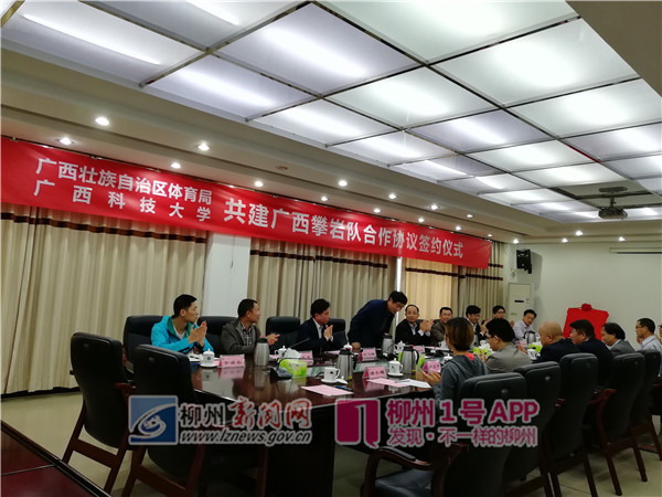 4月11日下午3点,自治区体育局、广西科技大学在广西科技大学行政楼6—1会议室,一同签订广西攀岩队“区队校办”合作协议。