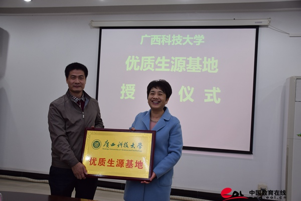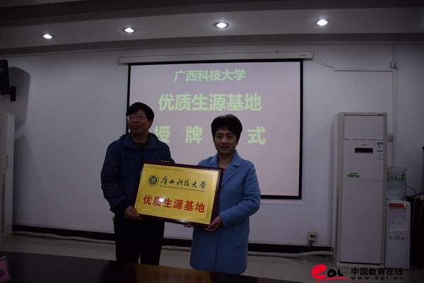 活动现场进行了优质生源基地合作授牌,广西科技大学覃萍副书记给参加会议的高中学校代表进行了授牌,并表示,接下来,广西科技大学将和生源基地单位紧密联系,提供及时的招生信息。