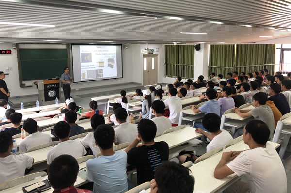 Yu教授给同学们讲解了新型复合材料根据温度差产生电能的原理,着重介绍了热能充电超级电容器基础结构模式的工作原理,同时就锂—硫电池,锂—氧电池的性能与传统钴酸锂电池进行了比较分析。在交流互动环节,Yu教授与同学们一同探讨了未来新能源电池发展的潜力与研究方向,以及他在科研生涯方面的一些经验,使学生们深受启发。