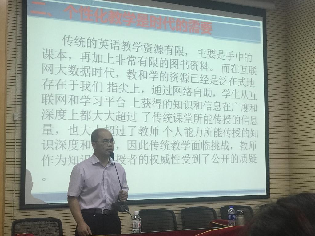 韦汉主要研究方向是现代外语教育技术的理论与实践和计算机辅助翻译,是教育部第三批大学英语教学改革示范项目主持人,多次获得自治区教学成果奖,出版译著、教材5部,发表学术论文40余篇,具有丰富的英语教学经验。韦汉教授的讲座从英语教学改革的背景出发,分别阐述了个性化教学的时代性,智慧测试是考试的革命性变革以及以智慧测试驱动的大学英语个性化教学模式。韦汉还跟老师们分享了桂电专为个性化教学而研发的智慧测试与学习平台,该平台以智慧测试为导向,为个性化教学提供了技术和工具保障,是可以借鉴的一个很好的测试平台。最后的交流环节,老师们积极提问交流,现场气氛轻松活跃。