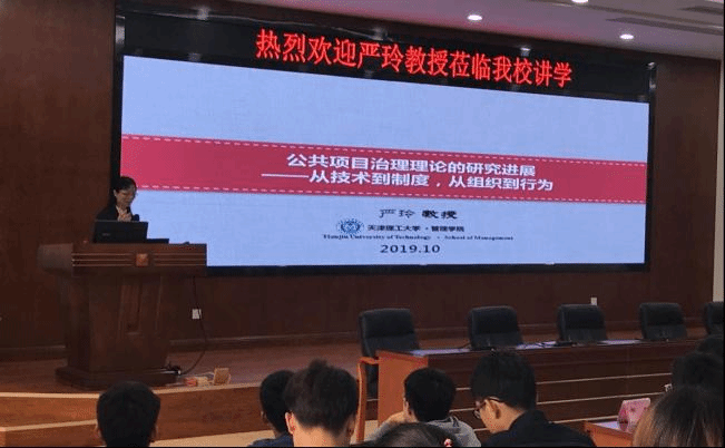 10月30日上午,天津理工大学严玲教授应邀到我校,在第四教学楼国际学术报告厅作题为《公共项目治理理论的研究进展——从技术到制度,从组织到行为》的学术报告。报告会由土建学院研究生会承办,土建学院院长吴辉琴主持,土建学院部分老师、研究生和本科生共同聆听了报告。
