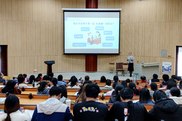 黄蕾在报告中主要讲述了医生的职业特点和医生的职业素养之间的关系,结合实际案例分析,提出医务人员在工作中应强化职业素养,提高职业认同,促进心理健康,预防职业倦怠。报告会结束后,黄蕾与现场师生进行了互动,气氛活跃。