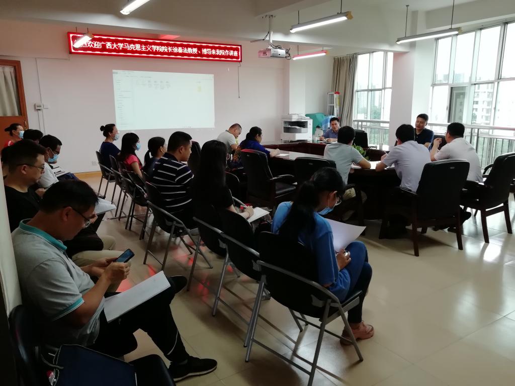 6月10日上午,广西大学马克思主义学院院长徐秦法教授应邀到我校开展科研课题申报辅导讲座。马克思主义学院副院长戚杰强主持讲座。此次项目申报负责人及部分教师参加讲座。