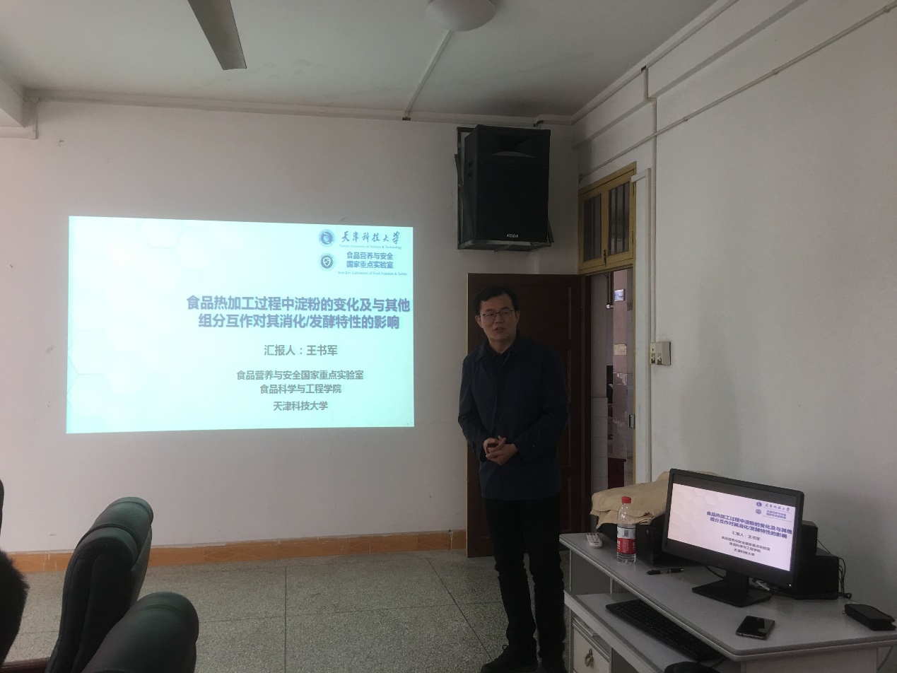 报告会上,王书军教授从不合理饮食对身体健康存在的威胁出发,就课题的研究背景、淀粉在人体中的变化及不同加工过程对其性质的影响、热加工过程中淀粉与脂类等组分互作及对其消化和发酵特性的影响变化、课题组研究的主要方向和内容以及天津科技大学学科及科研平台基本情况等作了详细介绍。