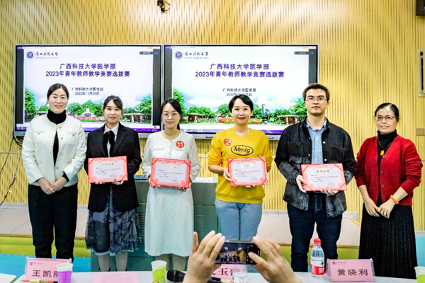 本届比赛上午下午全程线上直播,当天无课的40岁以下教师线上观摩比赛。评委组由7名学部评委、30名大众评委和6名学生评委组成。紧张有序的比赛,展示了医学青年教师们扎实的教学基本功,促进了各教学单位青年教师之间的交流学习。来自柳州市妇幼保健院的胡静老师和广西桂东人民医院的张文昌老师荣获一等奖,其余6名教师和8名教师分别荣获二等奖和三等奖。