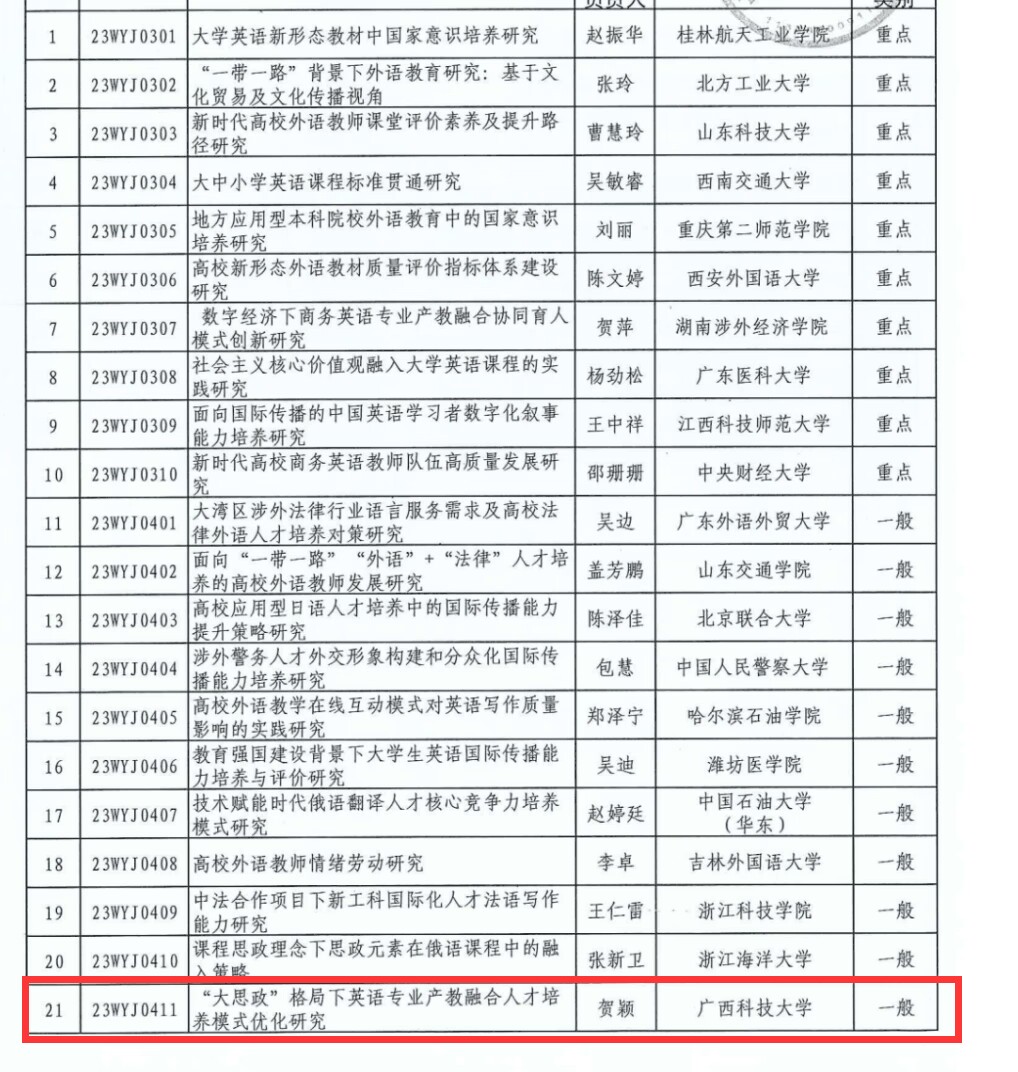近日,2023年国家社会科学基金年度项目、教育部人文社科研究一般项目、“广西高等学校千名中青年骨干教师培训计划”人文社科类立项课题和中国高等教育学会“2023年度高等教育科学研究规划课题”公布,外国语学院金钱伟博士、余意梦婷博士和贺颖老师申报的课题分别获得项目立项。