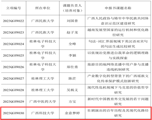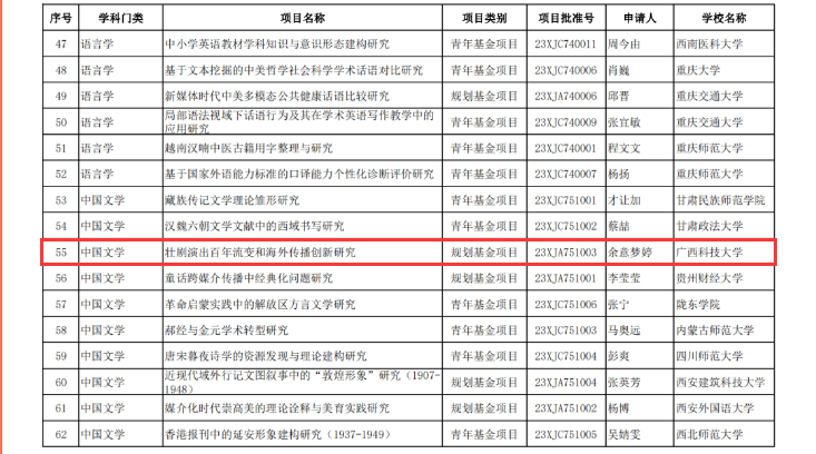 余意梦婷申报的课题分别获2023年度教育部人文社科研究西部项目和“广西高等学校千名中青年骨干教师培训计划”人文社科类课题立项,资助总经费20万元。