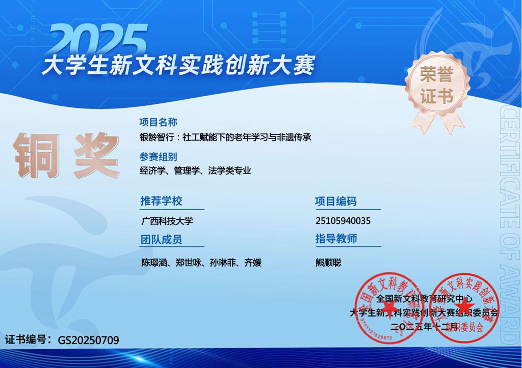 近日,第二届全国大学生新文科实践创新大赛评选结果揭晓。人文艺术与设计学院实践创新项目《银龄智行:社工赋能下的老年学习与非遗传承》从全国433所高校、2.5万余个项目中脱颖而出,荣获铜奖。