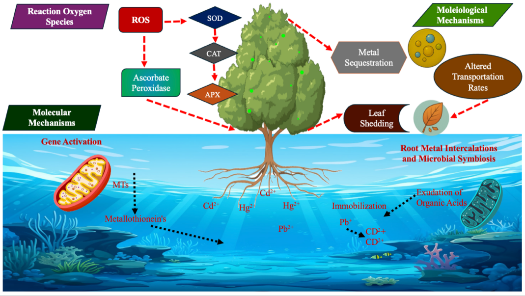 另外,重金属(HM)污染(包括镉(Cd)、铅(Pb)、汞(Hg)、砷(As)和铬(Cr))等可以引发生物富集、微生物群落紊乱及养分循环障碍。海洋红树林具有物种层面的金属耐受机制,包括液泡隔离、落叶脱落、抗氧化酶(SOD、CAT、APX)的激活,以及金属结合蛋白、植物螯合蛋白(PC)和金属硫蛋白(MT)的表达,这些机制共同降低金属生物可利用性并保护重要组织。根际微生物则通过转化有毒金属形态、产生螯合剂和铁载体以及稳定沉积物,进一步增强解毒作用。研究表明,与红树(Rhizophora mucronata)和白海榄(Sonneratia alba)相比,海芦(Avicennia marina)表现出更优的富集能力、抗氧化反应及微生物辅助解毒作用,凸显了物种选择对有效海岸修复的重要性(图2)。研究结果强调,将植物-微生物相互作用与生态考量相结合,可增强激素代谢物(HM)的解毒能力,维持海岸生态系统韧性,并降低对人类健康的威胁。研究成果可以为制定针对性、可持续性且借助微生物的红树林修复策略提供了机制性见解和可操作性知识,推动了基于自然的海岸污染治理解决方案的科学认知与实际应用。