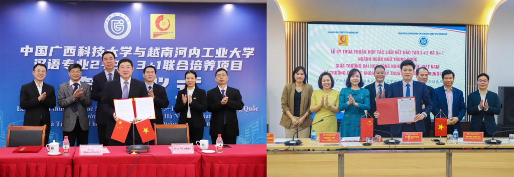 与越南河内工业大学、泰国诗纳卡琳威洛大学建立了汉语、英语本科专业“2+2”“3+1”联合培养项目。其中,“广西科技大学与河内工业大学汉语本科2+2联合培养项目”是中国与越南高校首个本科学位联授项目。学校获得“广西高校来华留学教育进步最快单位”“汉语水平考试(HSK)网考优秀考点”“中国—东盟教育开放合作试验区来桂留学基地培育学校”等荣誉称号。