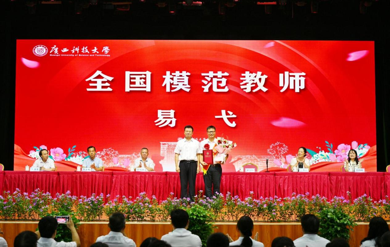 学校党委书记赵君为全国模范教师易弋送上鲜花并颁发荣誉证书