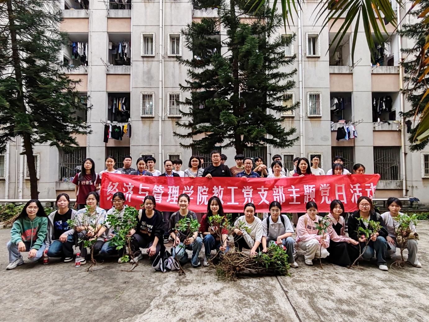 春暖三月,植树我先行。为进一步绿化美化校园,为建设美丽科大作贡献,3月27日下午,经济与管理学院教工、学生党支部在文昌校区南区学生宿舍尚理园共同开展“植树添绿”主题党日活动。学院党委书记莫勤德,党委副书记、纪委书记韦齐齐以及各党支部党员代表50多人参加了活动。