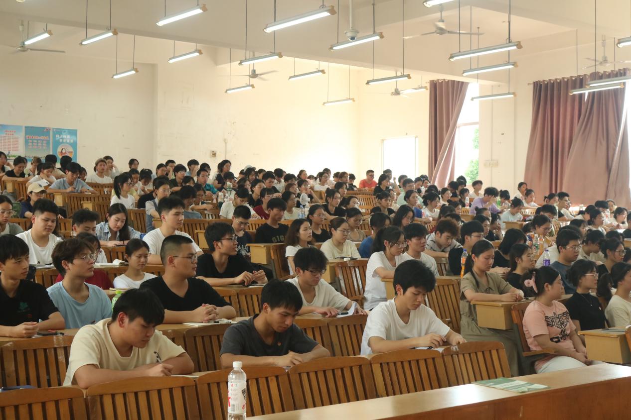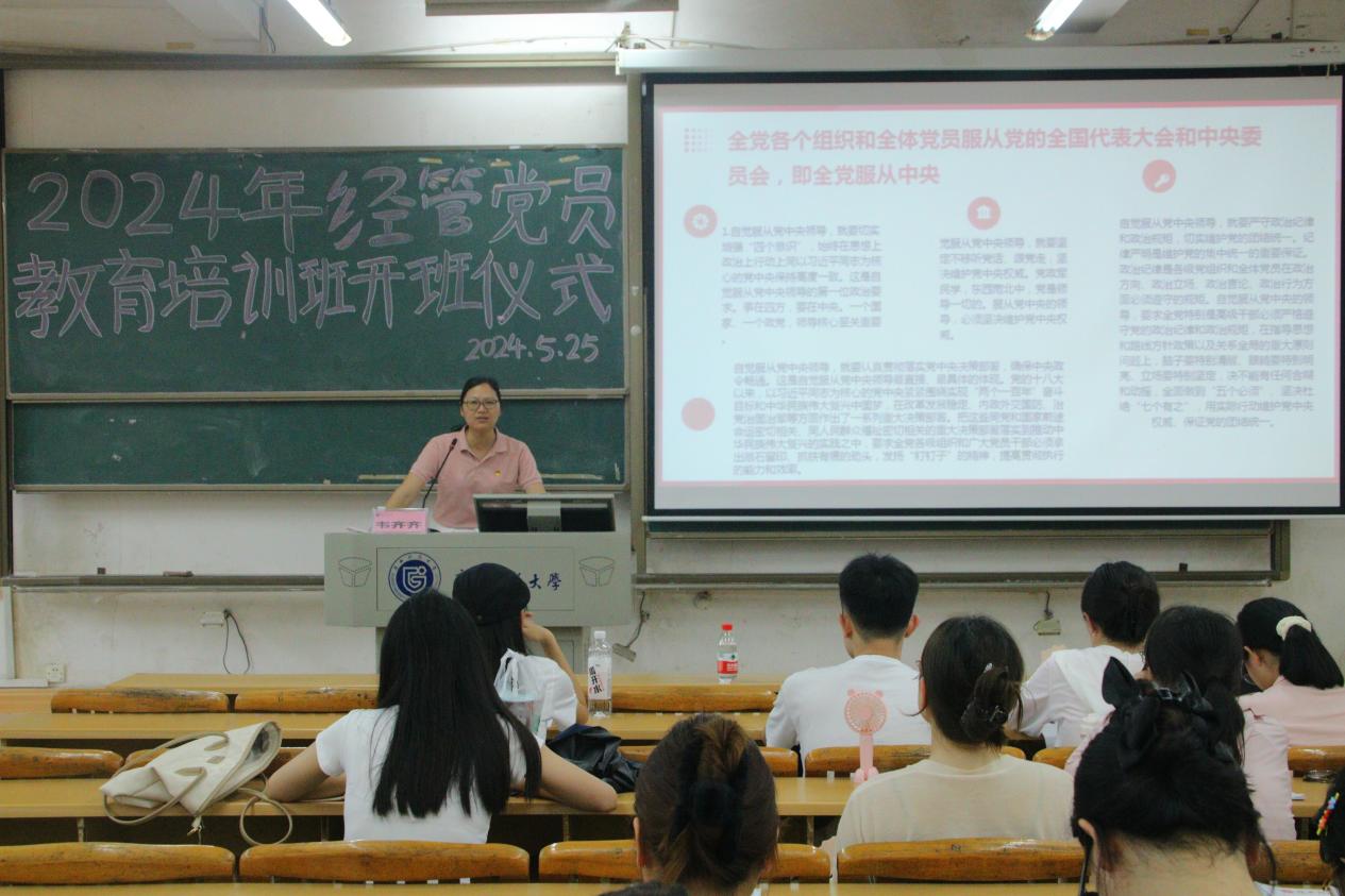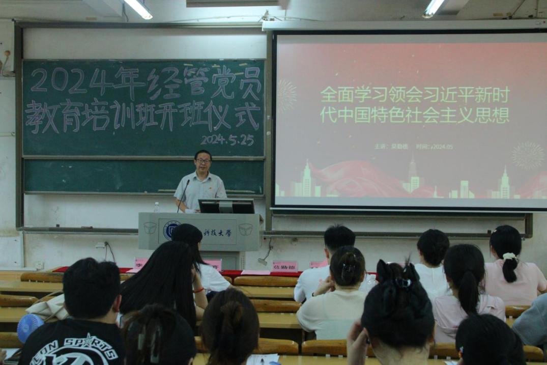 5月25日下午,经济与管理学院在第四教学楼4阶3和4C101教室分别举办入党积极分子和党员教育培训班。学院党委书记莫勤德以《全面学习领会习近平新时代中国特色社会主义思想》为题,党委副书记、纪委书记韦齐齐以《中国共产党的组织制度、纪律和作风》为题,轮流为党员、入党积极分子讲授党课,学院132名党员和300多名入党积极分子到场听课。
