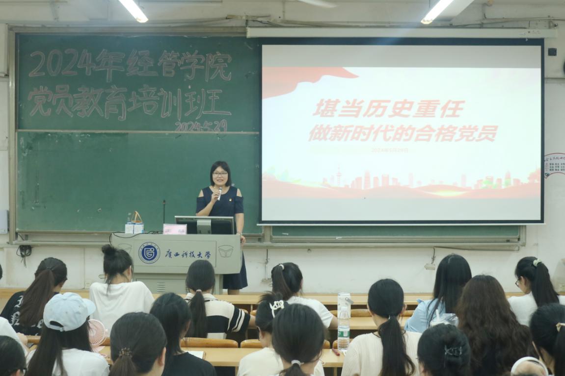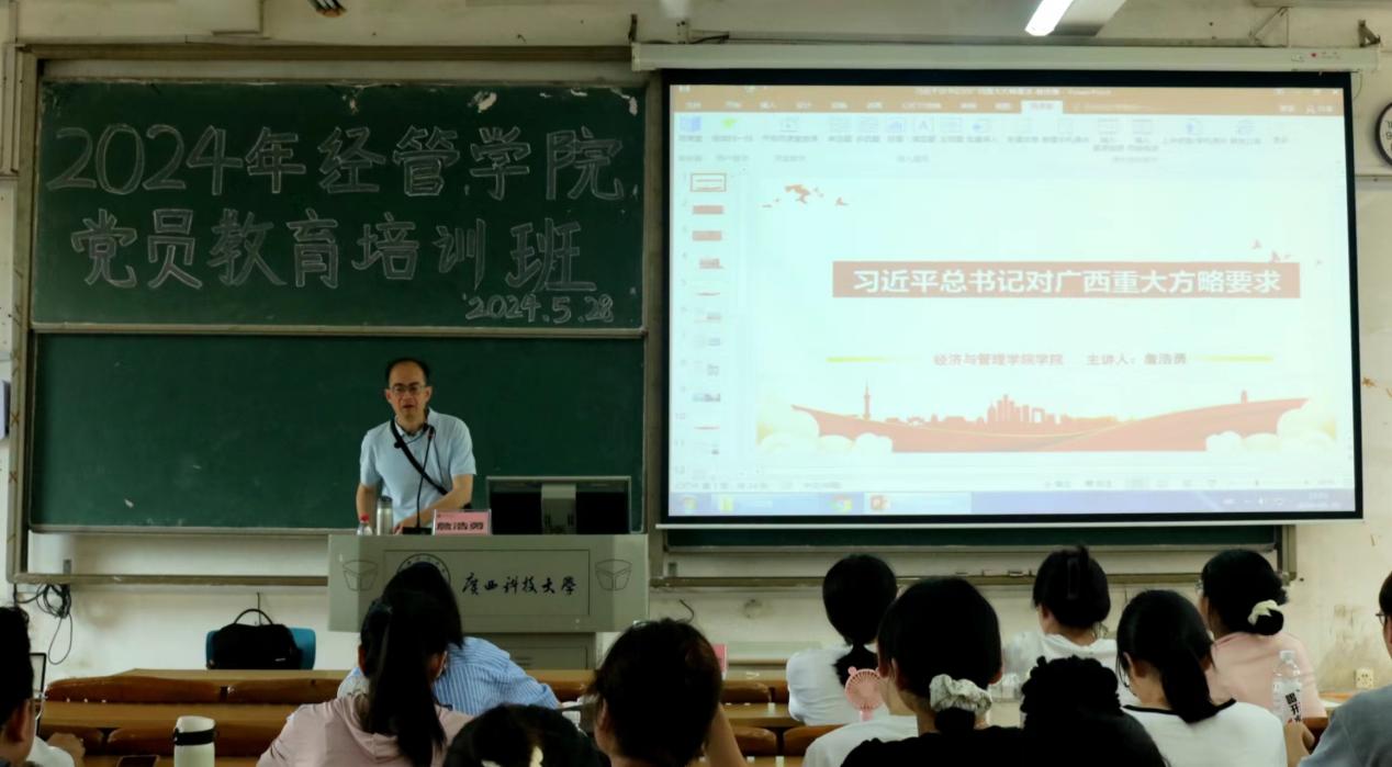 5月28日下午,在第四教学楼4C201教室,学院党委委员、应用经济系教工党支部书记詹浩勇教授以《学习习近平总书记对广西重大方略要求》为题,为学院全体学生党员讲授党课。