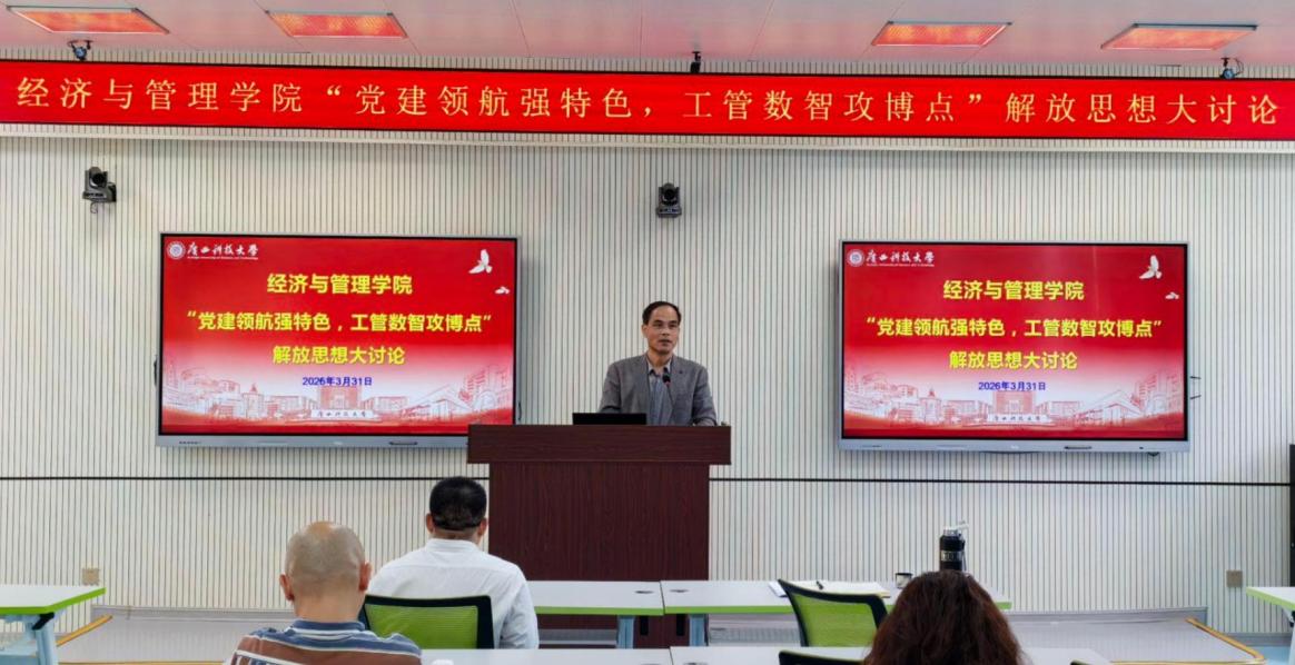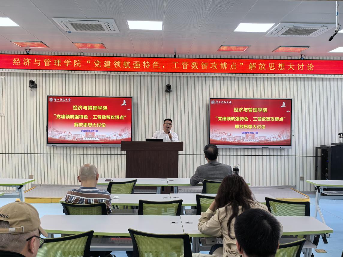 为深入贯彻落实2026年政府工作报告精神,凝聚学科发展共识,全力推进博士点申报攻坚工作,3月31日下午,经管学院在4D403会议室举办“党建领航强特色、工管数智攻博点”为主题的解放思想大讨论。全院教职工参加了本次会议,会议由院党委书记庞晓红主持。