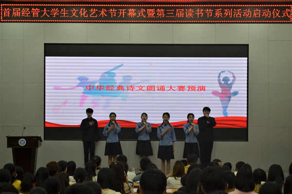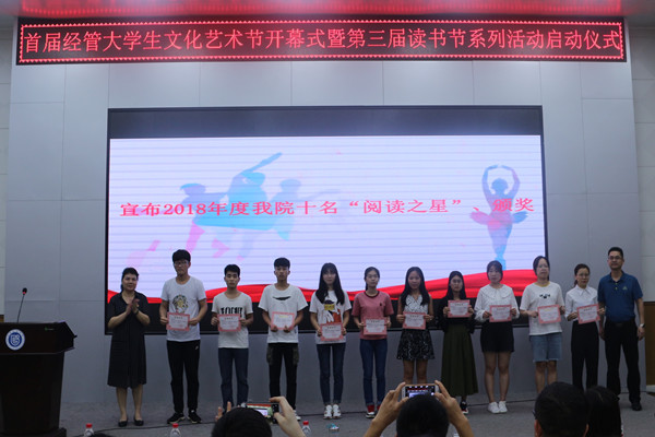 廖奕、卢志平分别为荣获2018年度“阅读之星”的十名同学颁发了荣誉证书。“阅读之星”代表,国贸152班的黎秀英同学,跟大家分享了自己的读书心得。学院艺术团主持队的同学们为大家表演了诗朗诵《我用残损的手掌》和《七律·长征》。廖奕作总结发言,她说首届经管大学生文化艺术节汲取了原来学院文化的丰富营养,是传统传承基础上的创意,持续做下去,不断创新,将营造出积极向上的新经管校园文化氛围。她与大家分享了世界读书日的来历、意义及自己的读书心得,希望同学们一生能与好书为伴,养成阅读的习惯,让书香满校园。