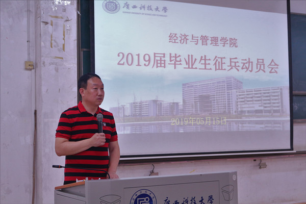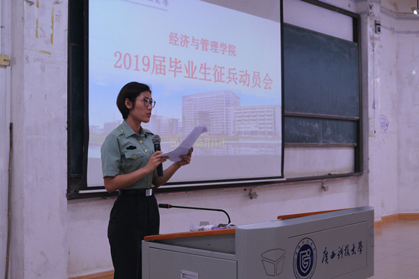 为进一步贯彻落实国家鼓励普通高等学校大学生应征入伍服义务兵役的精神,按照学校和上级征兵工作要求,5月15日上午,经济与管理学院在四阶一教室召开了2019届毕业生征兵动员会,学院党委副书记陈学智和相关辅导员老师参加了本次会议。