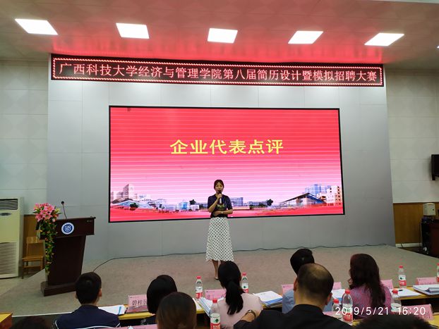 决赛通过播放选手VCR、选手自我介绍和能力阐述、企业现场提问以及企业考量提供offer双向选择等流程逐项进行。针对求职意向,每位选手都表现出自己身上独有的亮点,面对评委的提问,选手也积极巧妙作答。比赛结束后,交通银行股份有限公司柳州分行跃进支行行长毛玉枫女士代表所有企业发表点评,她表示,决赛中的15位选手都非常优秀,各有特长,并欢迎同学们选择相关企业,到企业中实习成长;同时,毛玉枫女士也代表企业对经管学院邀请大家参与本次活动表示感谢。