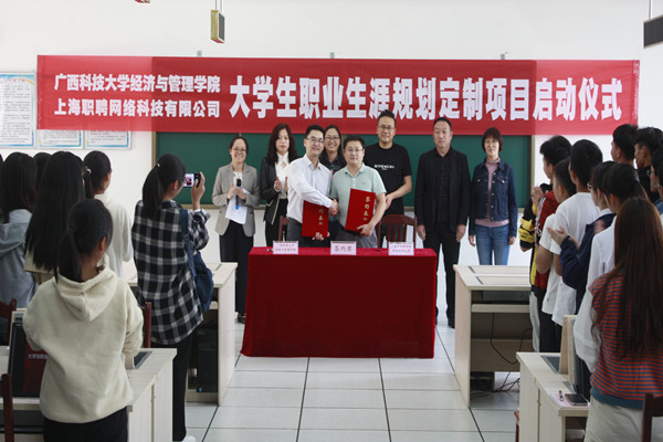 为了有效推进大学生职业生涯规划定制项目进展,10月18日下午,经管学院与上海职聘网络科技有限公司在东环校区第四教学楼D407教室(经管学院创新创业实验室)举行了项目启动暨签约仪式。上海职聘网络科技有限公司联合创始人、经管学院校友程强,上海职聘网络科技有限公司经理胡俊生,经管学院院长卢志平,学院党委副书记韦齐齐、陈学智,管理科学与工程系主任刘文芳,物流管理专业2019级班主任郭红霞,物流管理191、192班(项目试点班级)80多名新生参加启动暨签约仪式。仪式由物流管理专业负责人梁斐雯主持。