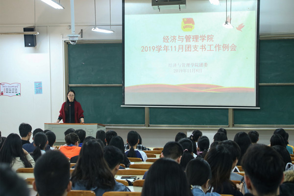 2019年11月8日,经济与管理学院团委在第六教学楼北103教室,召开2019年11月团支部书记工作例会,会议由学院团委书记翁文雯主持,学院全体团支部书记、副书记参加了本次培训。