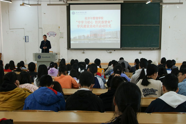为落实学校学风建设的有关要求,引导学生进一步明确学习目标,2019年11月20日,经济与管理学院在第四教学楼举行了学风建设活动启动仪式。学院党委副书记、纪委书记韦齐齐老师,党委副书记陈学智老师,团委书记翁文雯老师,各年级辅导员及各班班长、学委共同参与了启动仪式。