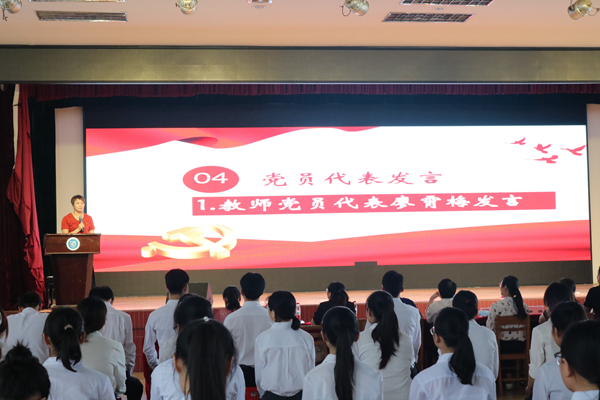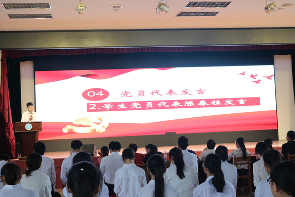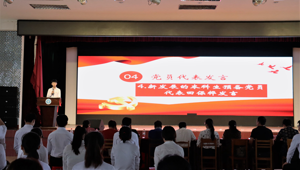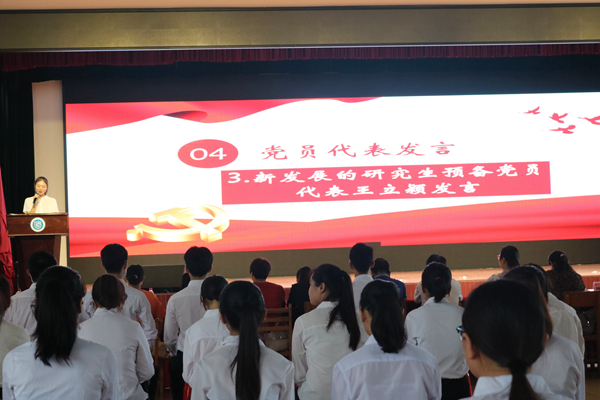 教师党员代表廖霄梅、学生党员代表陈春桂以及新发展的研究生预备党员代表王立颖、本科生预备党员代表田保桦上台发言,一一送上对中国共产党九十九周年华诞的祝福,并表示要在实践中锤炼意志,在服务群众中增长本领,在担当时代使命中实现理想,为实现中华民族伟大复兴贡献青春力量。