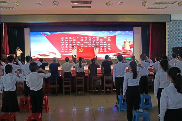 全体党员同志在党旗下庄严宣誓,新党员入党宣誓,老党员重温入党誓词。