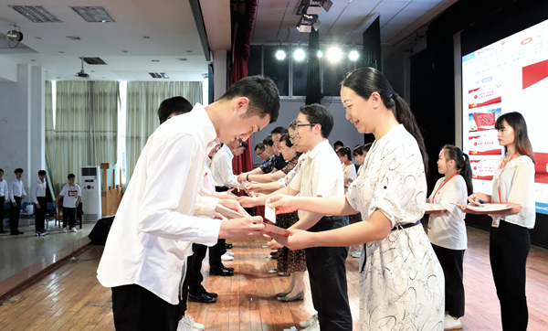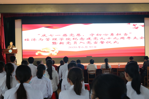 6月30日下午,经济与管理学院在东环校区大学生活动中心,举行“庆七一感党恩,守初心勇担当”庆祝建党九十九周年大会暨新党员入党宣誓仪式,学院党委委员、党支部书记、正式党员代表以及新发展的112名预备党员参加了本次大会,大会由学院团委书记、党办主任翁文雯主持。