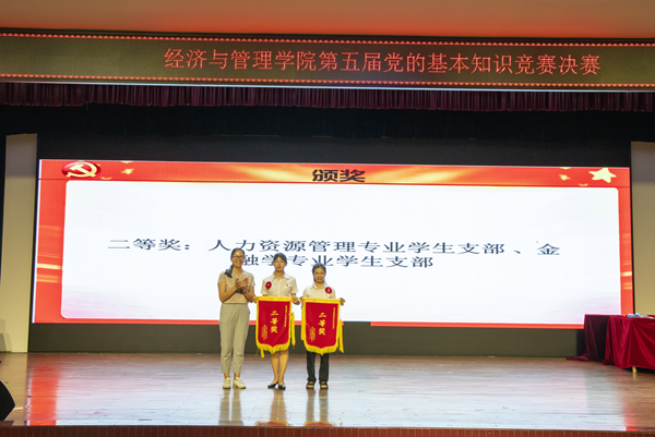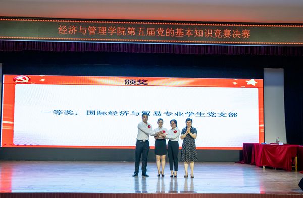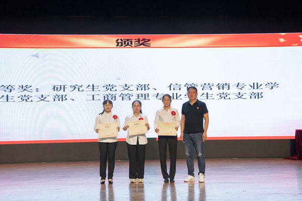 本次知识竞赛设有“满腹经纶”必答题,“出类拔萃”抢答题,“先声夺人”红歌影视竞猜,“巅峰对决”大挑战四个环节。各组参赛队员积极备赛,以饱满的精神状态和昂扬的斗志投入到比赛中。经过前两轮紧张激烈的头脑风暴答题后,各参赛队伍的比分明显拉开了差距。红歌影视竞猜环节,紧张的抢答中充满着欢声笑语,选手们反应机敏、迅速抢答,尤其是国际经济与贸易专业学生党支部频频勇夺分数,赢得了现场观众的阵阵喝彩,将比赛的热烈气氛推到高潮。在最后一个挑战赛环节中,参赛队伍根据得分情况选择了不同分值的风险题,在挑战与考验中权衡进退、展开竞争。经过四个环节的激烈角逐,国际经济与贸易专业学生党支部获得一等奖,金融学专业学生党支部和人力资源管理专业学生党支部获得二等奖,研究生党支部、信管营销专业学生党支部、工商管理专业学生党支部获得三等奖。