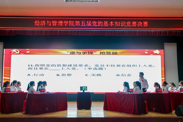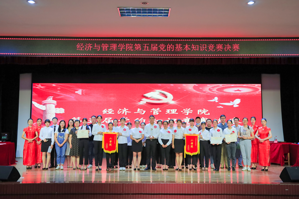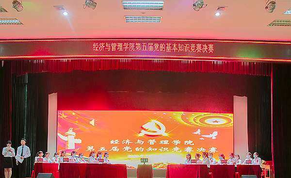 7月2日晚,经济与管理学院第五届党的知识竞赛决赛在大学生活动中心举行。经过初赛的激烈角逐,在学院11个学生党支部中,研究生党支部、金融学专业学生党支部、信管营销专业学生党支部、国际经济与贸易专业学生党支部、人力资源管理专业学生党支部、工商管理专业学生党支部共6个学生党支部脱颖而出进入决赛环节。学院党委书记廖奕,学院党委副书记、纪委书记韦齐齐,学院党委副书记陈学智以及各学生党支部书记、党员代表观看了本次比赛。