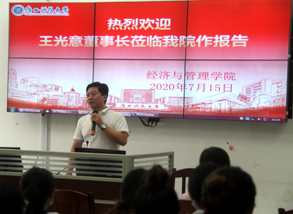 2020年7月15日下午,经管学院邀请广西易德新能源科技集团董事长在给四教楼4D407给学院师生作实习就业指导讲座。讲座由学院副院长朱晓琴主持,学院副书记陈学智、工商管理系系主任管仕平、专业负责人及专任教师出席,2017级工商管理系学生到场聆听讲座。