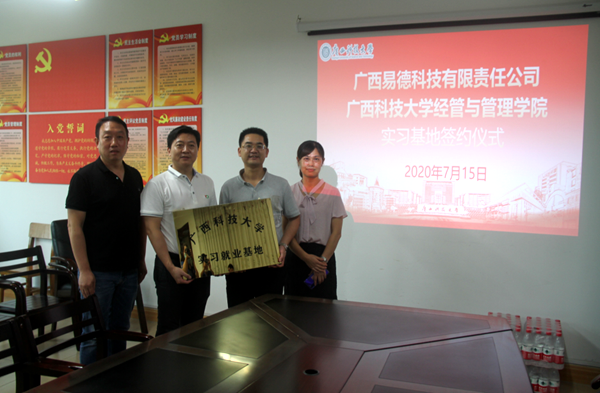 会后王光意董事长代表广西易德新能源科技集团有限公司与经管学院签署了实习就业基地合作协议,学院卢志平院长将“广西科技大学实习就业基地”的牌匾授予王光意董事长,双方合影留念,期待以实习基地建设为纽带加强双方合作,为师生提供更多实践就业的平台和机会,为企业培养更好的人才,实现互利共赢。