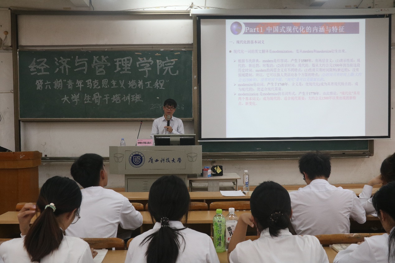 11月12日下午,经济与管理学院在文昌校区第四教学楼4C101教室举办第六期“青马工程”大学生骨干培训班。学院高级经济师、学校明灯讲师团成员黄伟新博士以《中国式现代化背景下青年的使命与担当》为题,向学院132名主要学生干部进行授课。他号召同学们深入了解和学习中国式现代化的内涵与特征以及面临的挑战,深刻理解当代青年在新时代需要承担的时代使命,争做明大德、立大志、成大才的栋梁之才。