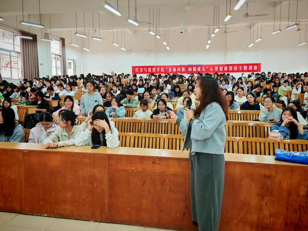 为助力女大学生全面健康成长,强化其自尊、自爱、自强的价值观,经管学院于11月1日下午在四阶三教室精心举办了一场以“拥抱青春,连接你我——女性成长与交往必修课”为主题的女生生理健康与人际关系专题讲座。此次讲座特别邀请到柳州市和谐婚姻家庭服务中心主任、国家二级心理咨询师及动力催眠师许静担任主讲嘉宾,2025级全体女生踊跃参与。