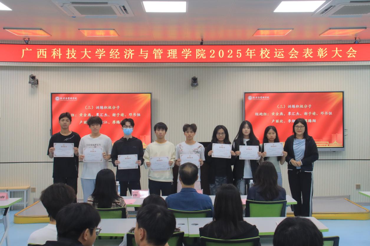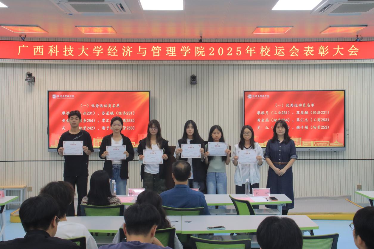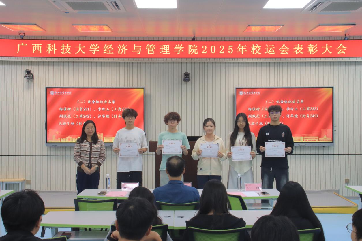 11月16日晚,经济与管理学院在第四教学楼4D403举办表彰大会,为在广西科技大学第四十届田径运动会上表现突出的运动员们颁奖。学院党委书记庞晓红、全体辅导员团学组织代表及获奖运动员出席本次大会。
