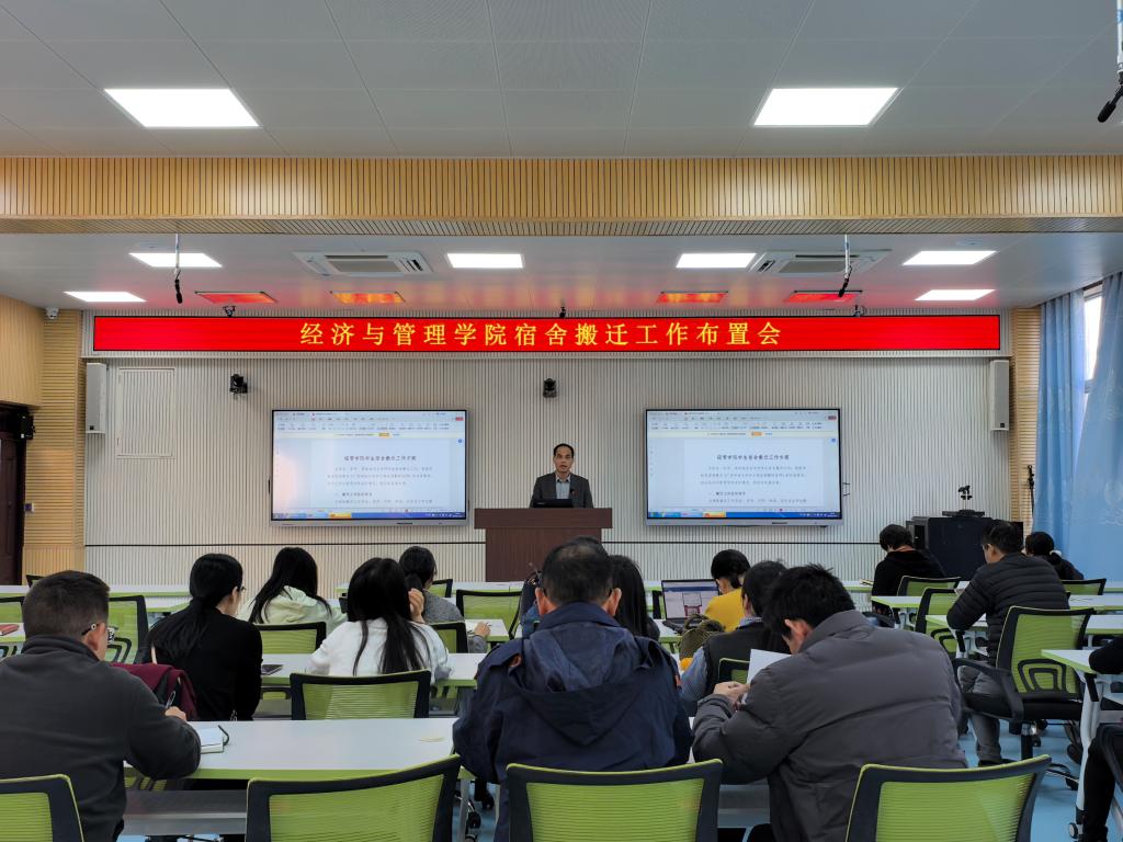 11月24日下午,经济与管理学院召开学生宿舍搬迁工作布置会。学院党委书记庞晓红、学院副院长廖霄梅、学院副院长梁斐雯及全体班主任参加会议。会议围绕本学期学生宿舍搬迁工作展开动员与具体安排,要求各班主任提高思想站位,密切关注并协助学生完成搬迁,及时为有困难的同学提供帮助,做好现场应急处置准备,并实时掌握学生搬迁动态,确保学生宿舍搬迁工作圆满完成。