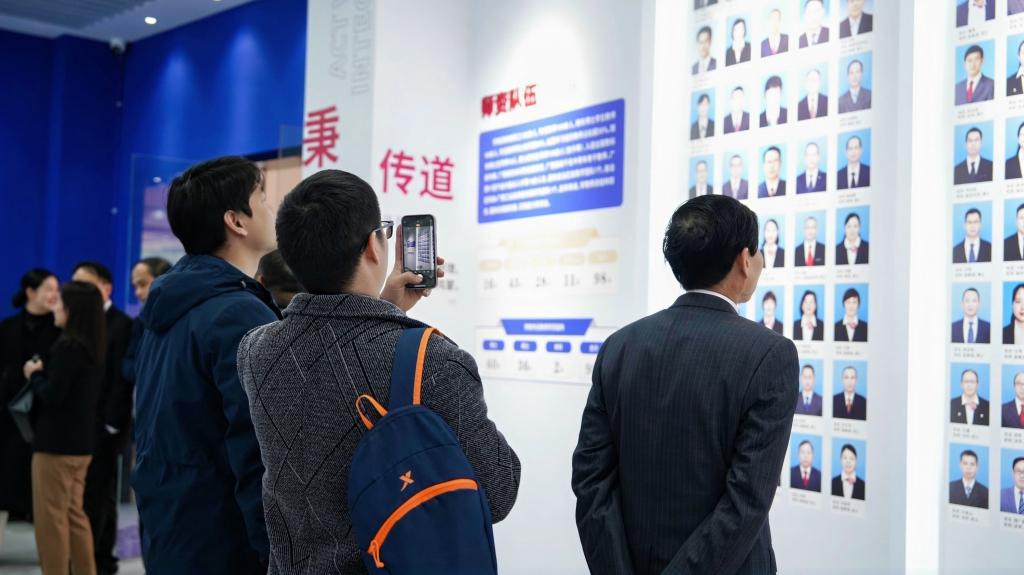 在热烈的气氛中,邓朗妮副校长、学院领导、校友代表与嘉宾共同为院史展厅揭牌。随后,与会嘉宾与师生代表有序进入展厅参观。展厅通过丰富的图文史料、实物展陈与多媒体技术,系统呈现了学院在党团建设、学科发展、人才培养等方面取得的丰硕成果与精神传承。