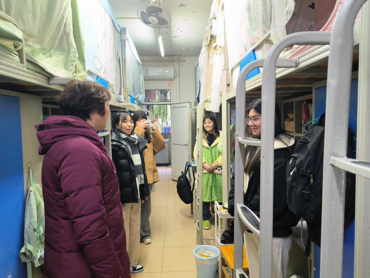 走访过程中,学院领导与老师们细致查看了各宿舍的卫生状况与安全设施,针对用电安全、物品摆放等进行了现场提醒与指导,叮嘱同学们务必增强安全意识,拒绝使用规定以外的电器,注意用电用水安全。时值期末备考阶段,老师们特别强调了诚信考试的重要性,鼓励同学们认真复习,以真实水平检验学习成果。同时,结合当前多发的网络电信诈骗案例,老师们向同学们普及了防诈骗知识,提醒大家务必提高警惕,保护好个人财产与信息安全。同时,老师们关心大家是否方便购买返家车票,希望同学们与家人团圆过年。