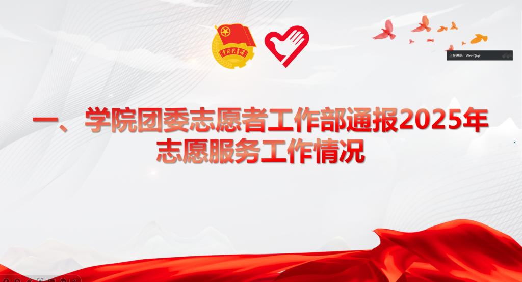 启动仪式上,学院团委志愿者工作部裴裕烽同学汇报了学院2025年志愿服务工作开展情况。过去一年,学院共组织开展志愿服务活动218次,累计参与志愿者达3505人次,服务总时长达18834小时。其中,学院投资者金融顾问大学生志愿服务队立足专业特色,深入社区、联动企业,积极开展金融知识普及与反诈宣传教育,覆盖群众2200余人,制作的宣传短视频获校级一等奖。