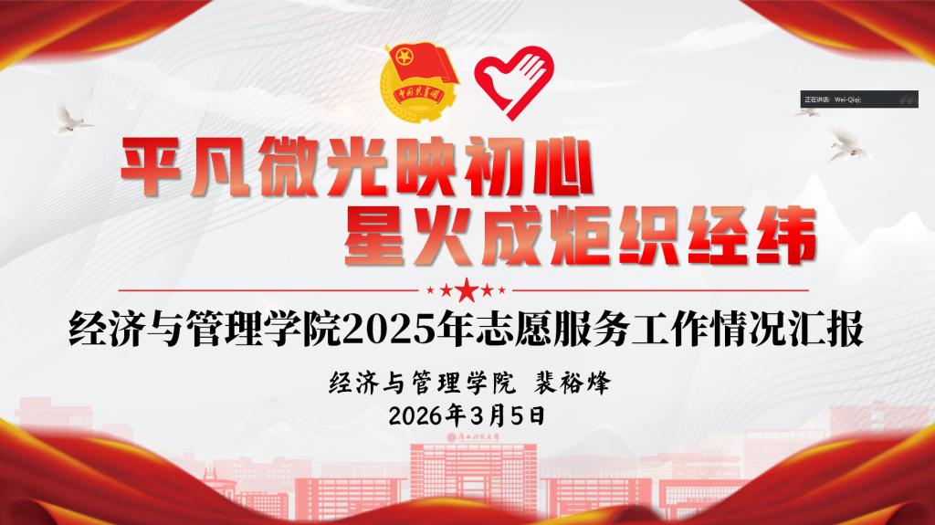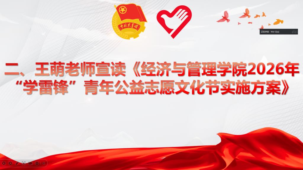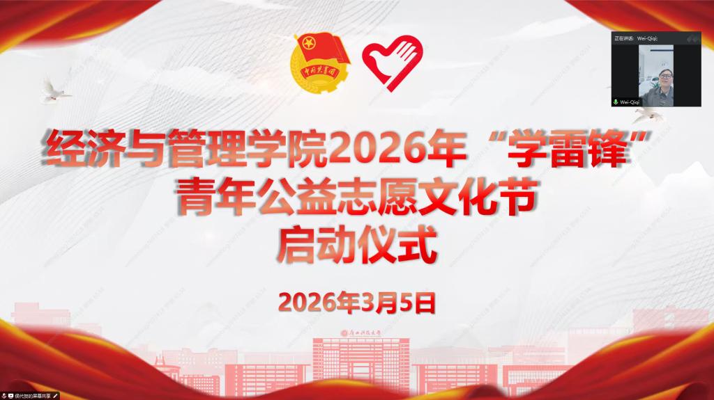 正值第63个“学雷锋”纪念日之际,3月5日,经济与管理学院通过线上方式举行2026年“学雷锋”青年公益志愿文化节启动仪式。学院党委副书记、纪委书记韦齐齐,学院团委副书记王萌、李睿,学院2024级辅导员王豪杰以及学院团学组织所有成员和各班级代表参加活动。