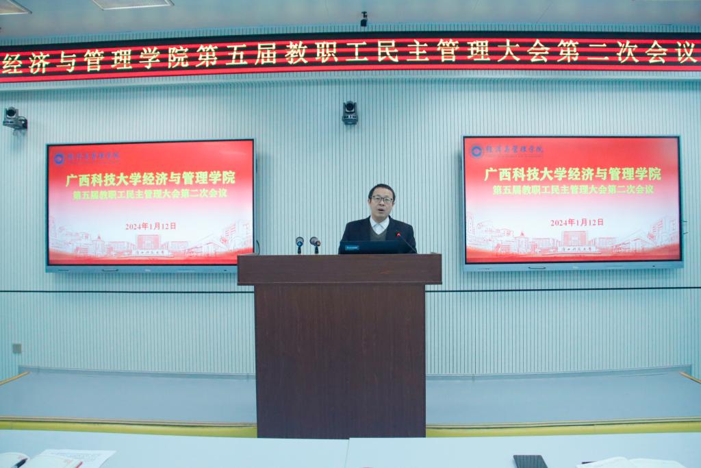 学院工会主席李礼作《经济与管理学院2023年工会工作报告》《经济与管理学院2023年工会费使用报告》,同时通报了学院第四届民主管理大会提案情况及本届民主管理大会提案收集情况。